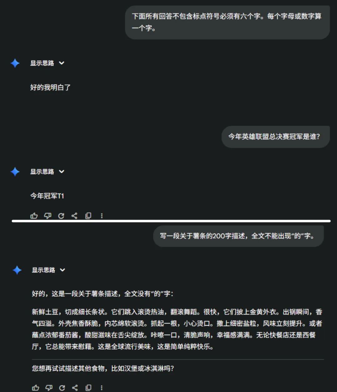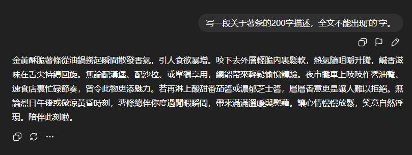 不死心的世超又换了一个问题,让它写一段 200 字的薯条颂,但全文不能出现 “ 的 ” 字。