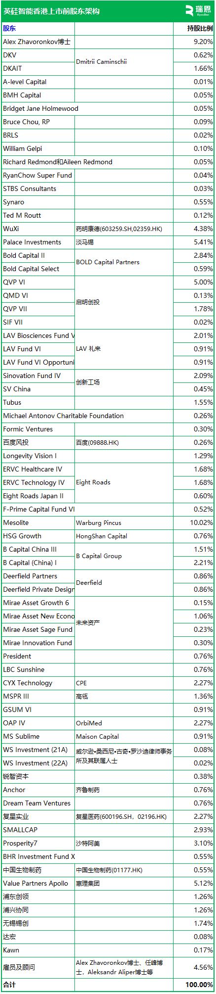 自2014年成立以来,英矽智能已经完成多轮融资。在今年年初完成E轮融资后,英矽智能的估值已超过13亿美元。截至目前,英矽智能股东名单包括多家明星风投和产业资本,如启明创投、创新工场、高瓴资本、药明康德、复星医药、沙特阿美旗下的Prosperity7Ventures等。