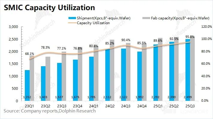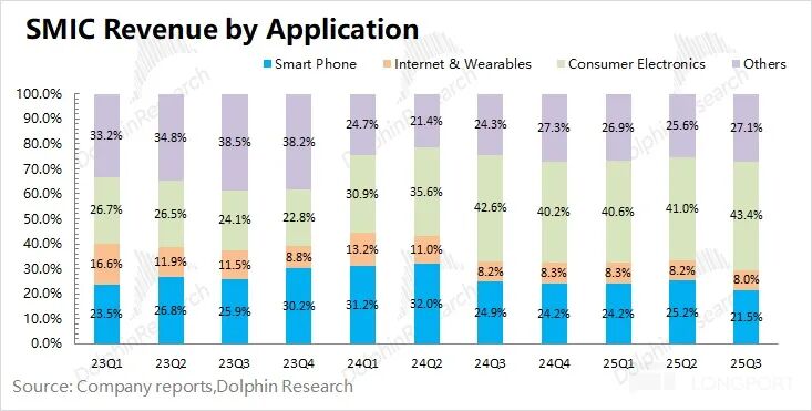 2025 年第三季度中芯国际的产能利用率 95.8%,本季度公司的产能利用率继续回升。结合公司的收入结构和下季度收入指引看,海豚君认为公司本季度产能利用率回升,主要是受消费电子类、工业及汽车和智能家居需求回升的带动。