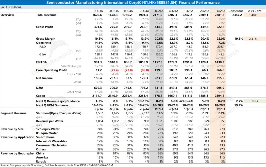 1、整体业绩:中芯国际在 2025 年第三季度实现收入 23.8 亿美元,基本符合市场预期(23.5 亿美元),环比增长 7.8%,略好于指引区间(环比增长 5-7%)。公司本季度收入端增长,主要来自于消费电子类、工业及汽车和智能家居类需求的回升。