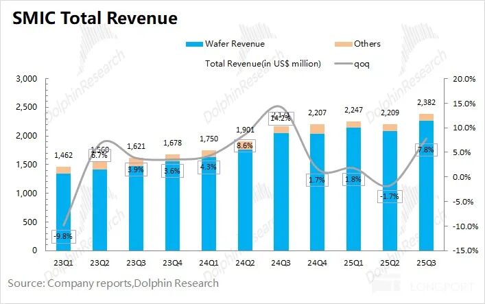 2025 年第三季度中芯国际实现营收 23.8 亿美元,环比增长 7.8%,略好于指引区间(环比增长 5-7%)。公司上季度的环比下滑,主要是受产线年度维修及设备改进等问题影响。