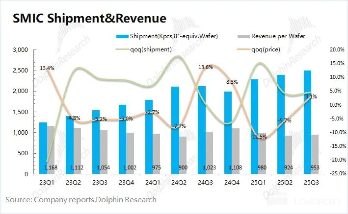1)量的维度,中芯国际本季晶圆付运量(等效 8 寸)达到2499 千片,环比增长 4.6%;
