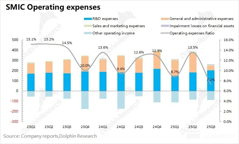 从经营开支角度看,本季度中芯国际经营开支是 1.7 亿美元,明显回落,主要是受公司本季度的管理费用减少的影响。本季度经营开支占比回落至 7.2%。