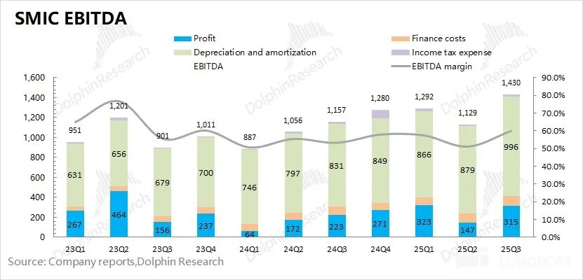 从 EBITDA 角度看,本季度中芯国际税息折旧及摊销前利润 14.3 亿美元,明显回升。