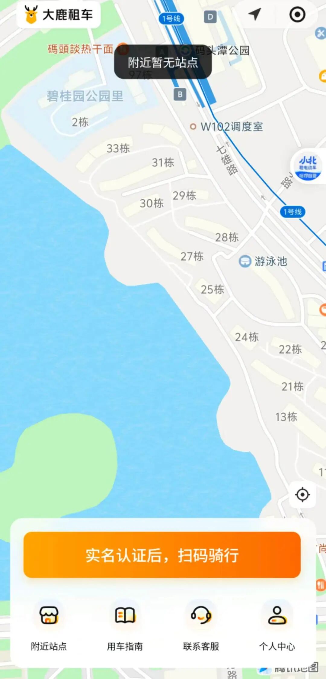 闪租则在步骤上更加便捷,到大鹿租车站点,找到立牌扫码,并选择租用车辆,点击响铃找车,通过车牌对比,找到站点的对应车辆即可骑行。归还时,也是将车骑行到原站点的指定位置,点击“去还车”即可。