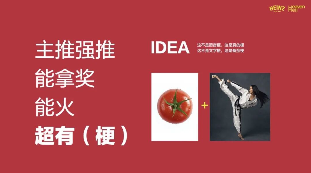 这句同样出圈的“想赢的番茄在亨氏里”,是Heaven&Hell合伙人金思涵在短短5分钟内构思完成的。