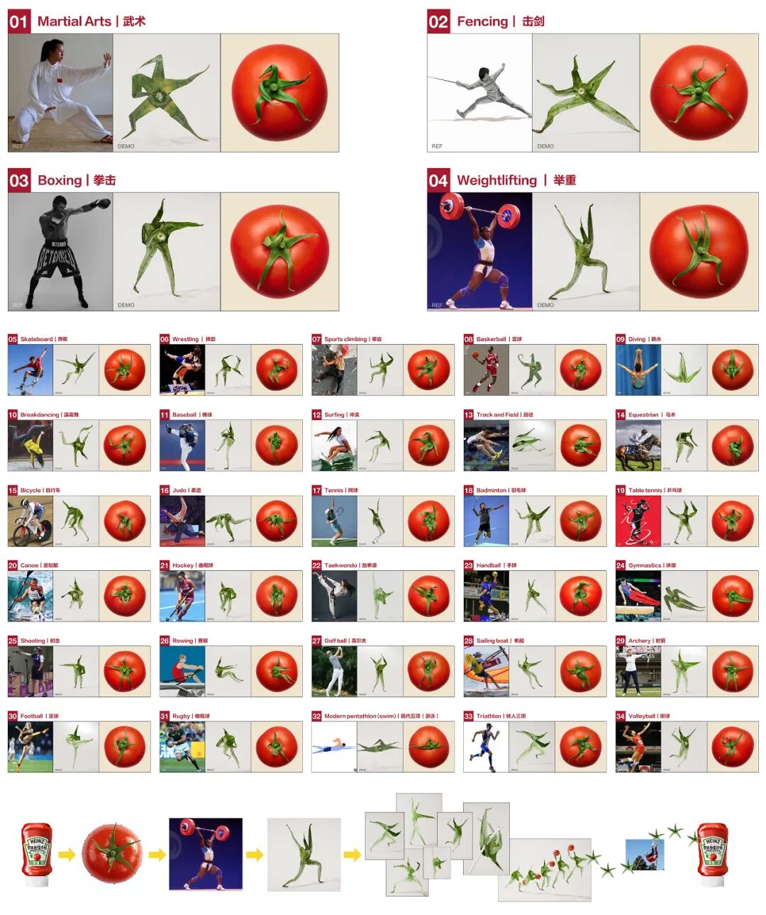 落实到具体设计上,最大的难点依旧在于:如何让天然形态的番茄梗叶,精准地传递出每一个运动项目的动态。