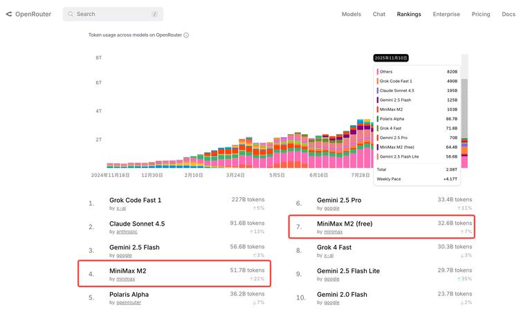 在实时更新的Leaderboard上,中国模型正全面崛起。MiniMax M2尤为突出,不仅是OpenRouter上第一个日token消耗量超过500亿的中国模型,并且免费版加付费版模型的Token日调用量已超过800 亿,都进入了Top 10(分列第4和第7),两者的用量都在高速增长。
