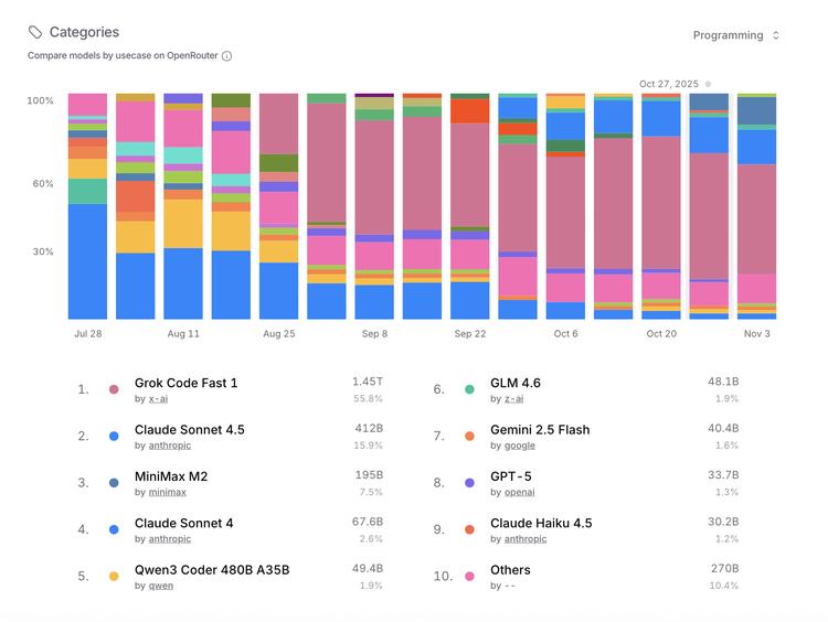 再看分类榜,在编程这个最复杂、最考验模型的场景下,MiniMax M2居全球用量第三,占据7.5%的份额。这就是中国开源模型的优势所在,M2凭借其低定价和长上下文带来的高单位经济性,正实打实地在OpenAI和Claude的手中切走份额。