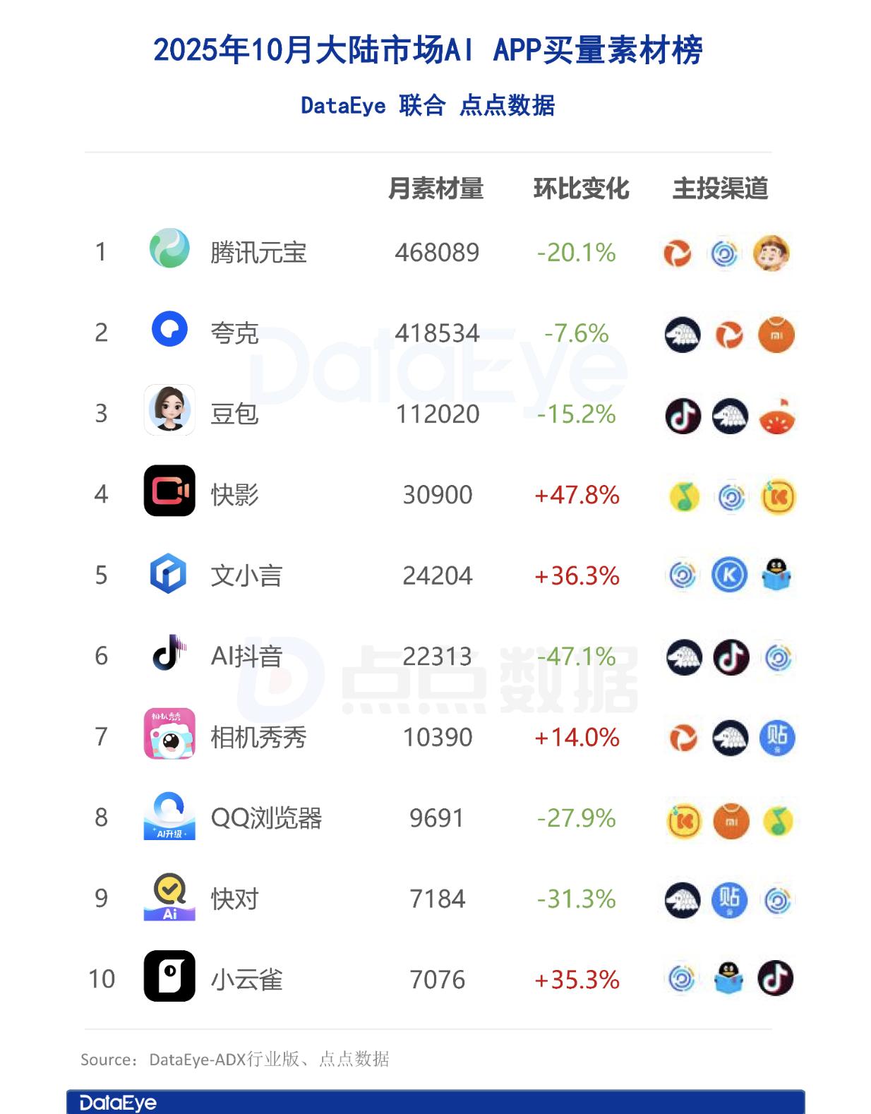 对于当下的拳头AI产品,腾讯尤其加深了对元宝的推广投入。第三方市场调研机构DataEye公布的数据显示,2025年至10月,腾讯元宝AI产品投放素材量(即买量)位列中国大陆AI应用市场Top1,其次是夸克和豆包。不过,在9-10月的iOS端头部AI APP下载量中,豆包依旧保持领先,腾讯元宝则位列第三位。