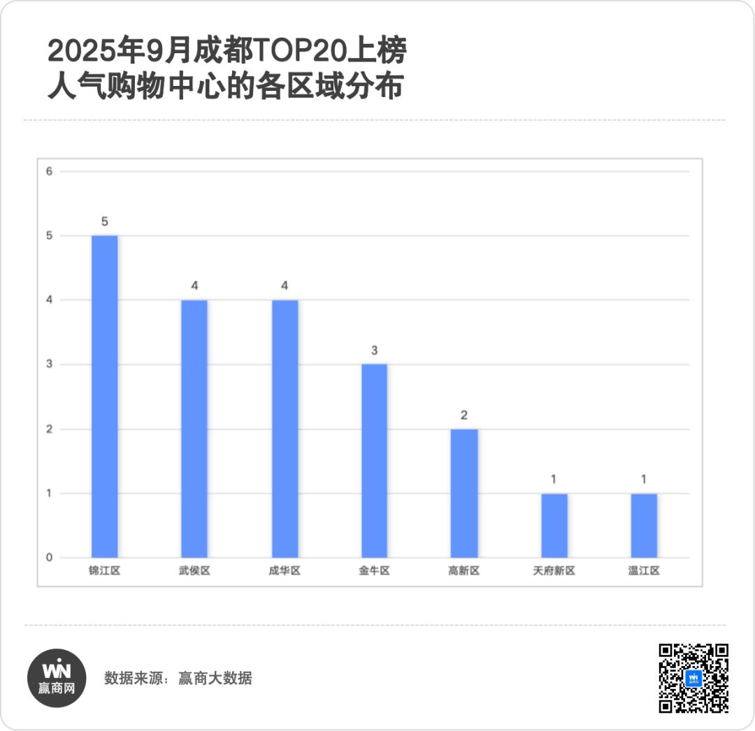 武侯区与成华区势均力敌,各占4席,成为成都商业的中坚力量。尤其值得注意的是成华区的崛起,凭借成都万象城的龙头效应以及龙湖滨江天街、天荟·万科广场等优质项目的集聚,已在杉板桥-建设路商圈形成了强大的商业集群效应,成为近年来成都商业格局演变中最亮眼的一极。