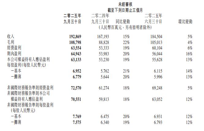 腾讯财报显示,三季度实现总收入1928.7亿元人民币,同比增长15%,环比亦录得5%的增长;期内盈利达到649.43亿元,较上年同期的539.8亿元增长20%;经营利润达725.7亿元,同比增长18%;