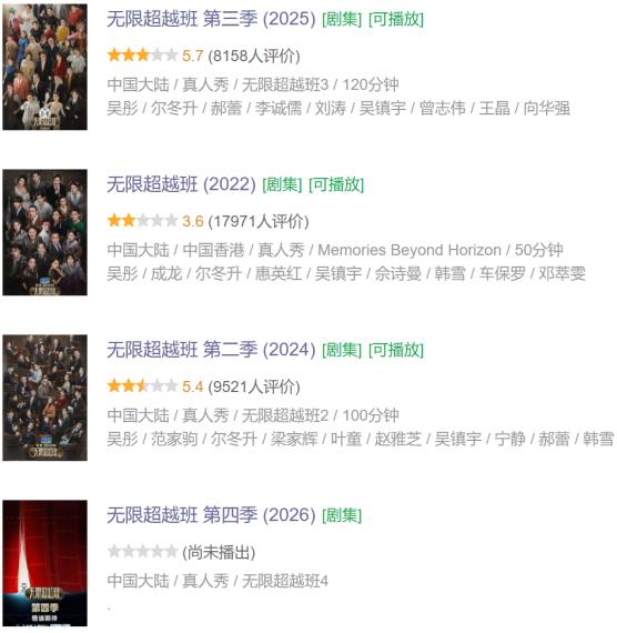 从节目所倒推出的策略来看,优酷的主要打法有两个。第一,是跟灿星、TVB、德云社、开心麻花、浙江卫视等合作方深度捆绑。作为灿星副总裁、导演陆伟一直是优酷顶尖IP《这!就是街舞》的核心角色。但该节目的前几季,在很大程度上是借助易烊千玺、张艺兴、王一博等顶流的流量,才实现破圈,当导师阵容转弱、好选手筛选完毕、观众阈值提高,自然会转向衰落,再加上灿星相关的种种官司、舆论风波,昔日的爆款气焰已慢慢消失不见。《麻花特开心》《无限超越班》这两个系列虽然也是优酷的招牌,但前者高度依赖沈腾&马丽这一黄金搭档,他们的档期问题让该节目无法一年一季;后者由于吴彤的惯用“手法”,让观众们又爱又恨,豆瓣评分一度低到3.6。