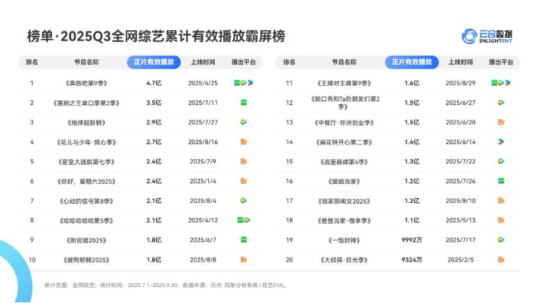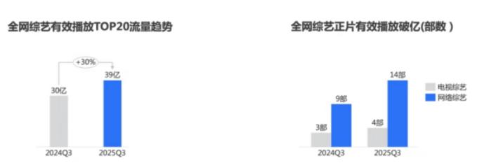 可以说,不论是综N代,还是新项目,优酷综艺的数据都还有很大的提升空间。但就在其答卷不及预期的同时,综艺市场整体却呈现上升趋势。2025年Q3全网综艺top20累计有效播放39亿,同比上涨30%,全网有效播放破亿综艺18部,同比增加6部,此消彼长,略微有点尴尬。