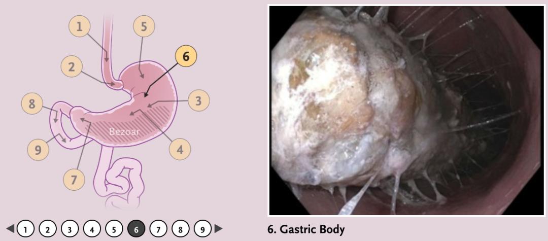 接下来的胃镜检查给出了答案,医生在她的胃里看到了一大块胃石,诊断胃石症。