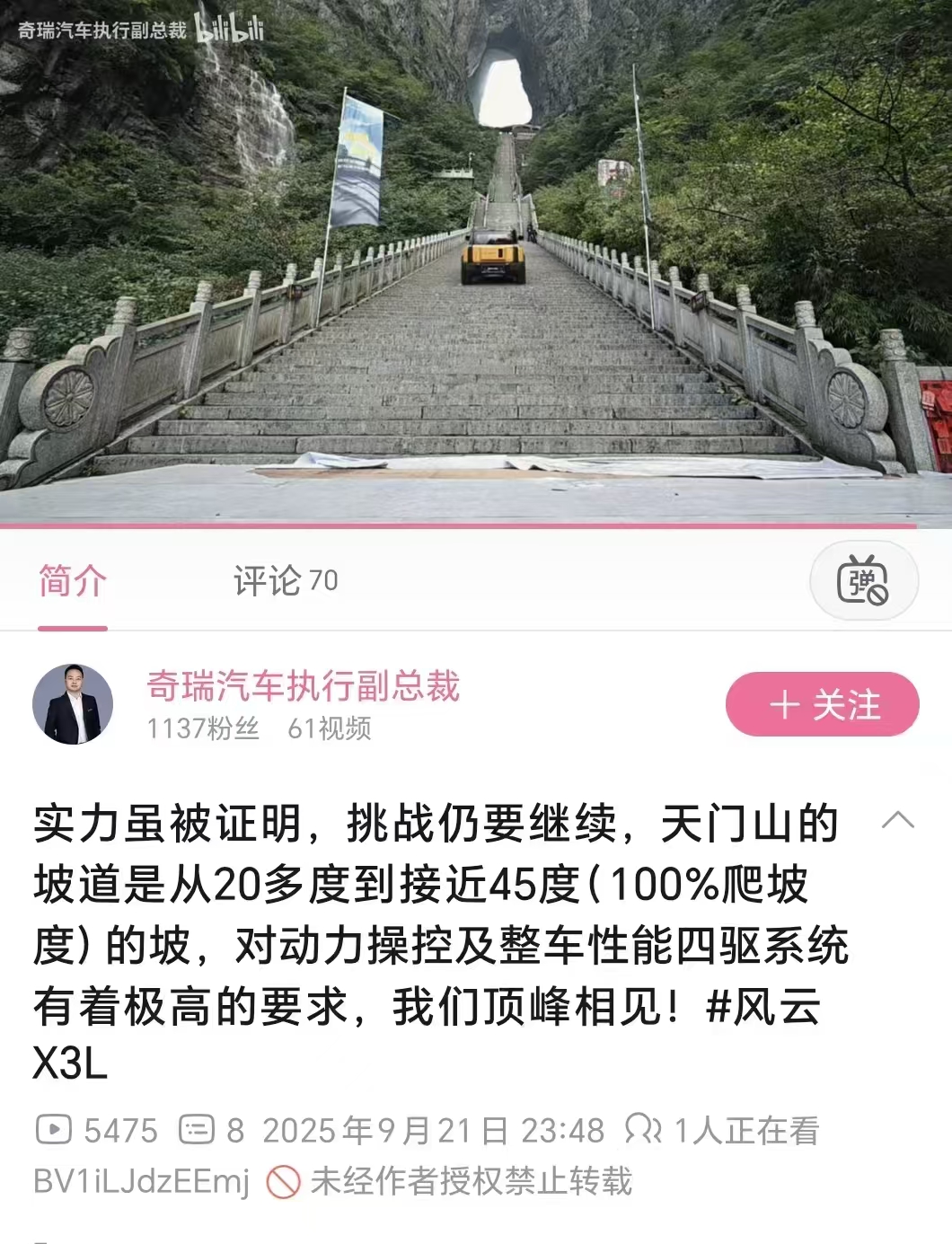 颇具讽刺的是,就在 9 月底,奇瑞汽车执行副总裁李学用还曾为这场挑战高调预热,称“顶峰相见”。如今回看这句话,配合网友拍摄的现场视频,显得格外刺眼。
