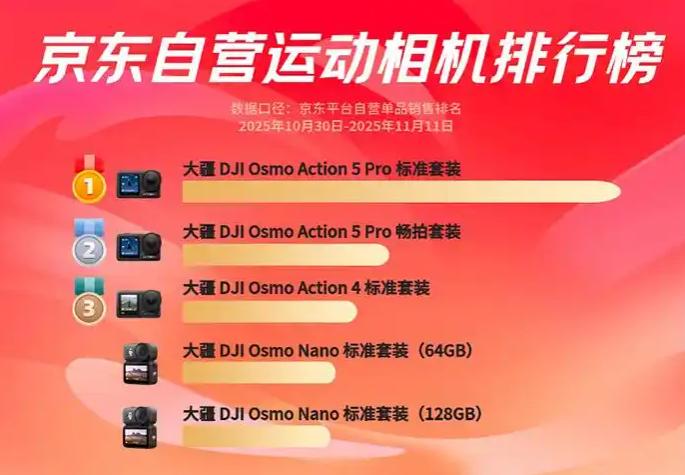 据2025中国电商发展报告显示,运动相机成交额暴涨6191%。其中根据京东自营平台在10月30日至11月11日期间发布的销售榜单显示,大疆凭借Osmo Action5 Pro、Osmo Action4、Osmo Nano等多款产品包揽运动相机品类前五名,坐稳销冠宝座。