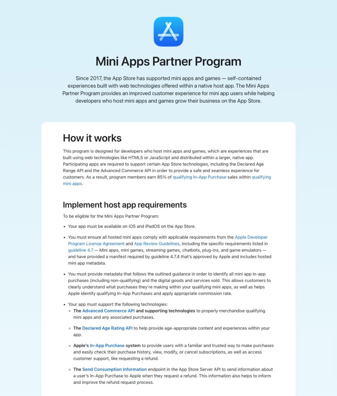 举例来讲,小程序开发者想加入该计划,托管小程序的宿主 App 必须支持苹果指定的多项关键 API: