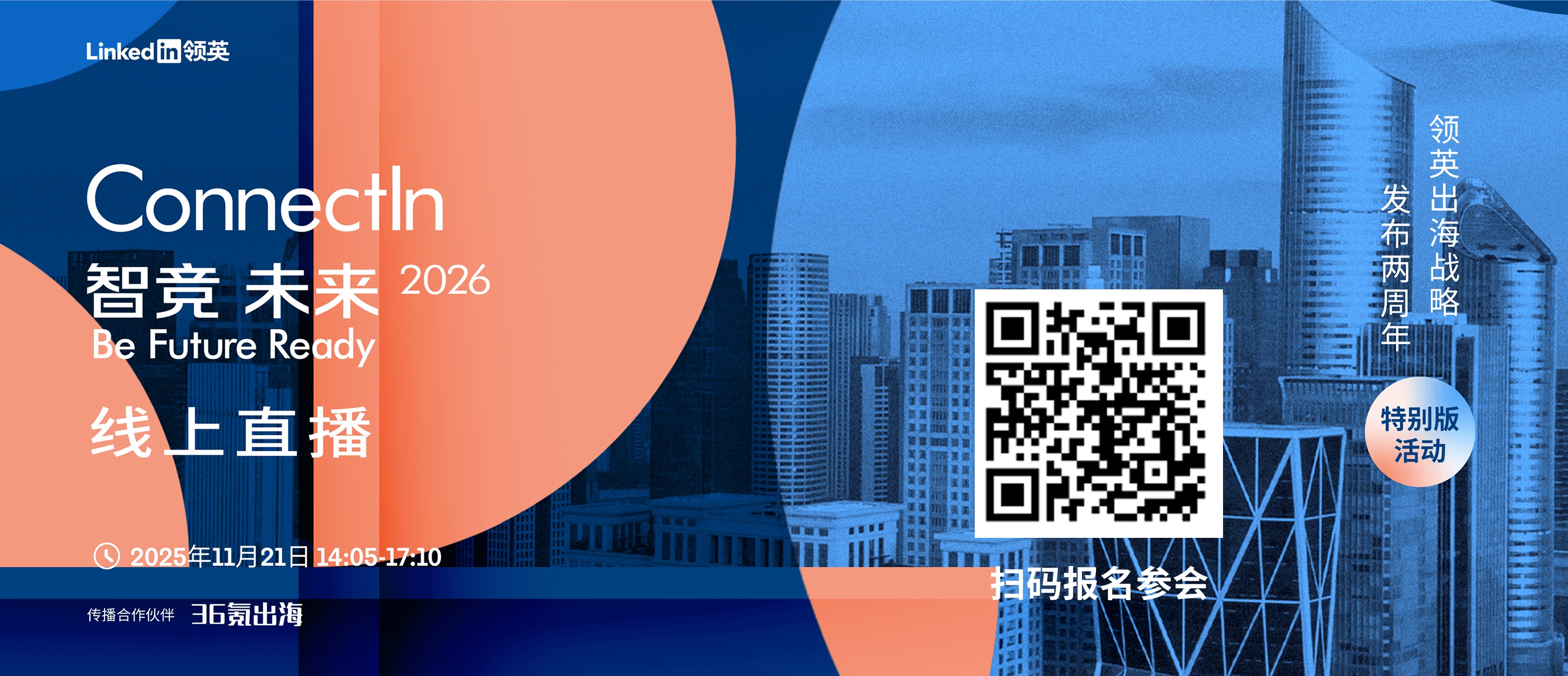 在全新的出海时代,面向未来的全球化人才,是稳步前行的核心。领英中国即将于11月21日进行 ConnectIn“智竞·未来”2026 出海峰会线上直播,聚焦 AI 时代的人才甄选、培养与发展,剖析各个市场的组织架构问题,助力出海企业把握 ESG、供应链、合规等新趋势,在国际舞台实现可持续增长。欢迎您点击“此处”或扫描下方二维码,填写表单,报名参加本次活动。活动报名将于2025年11月21日中午12:00截止。