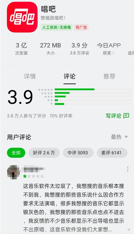 版权是另一个致命杀招。全民K歌背靠QQ音乐的庞大曲库,在版权方面具有天然优势;而唱吧作为独立应用,在音乐版权获取上较为艰难。