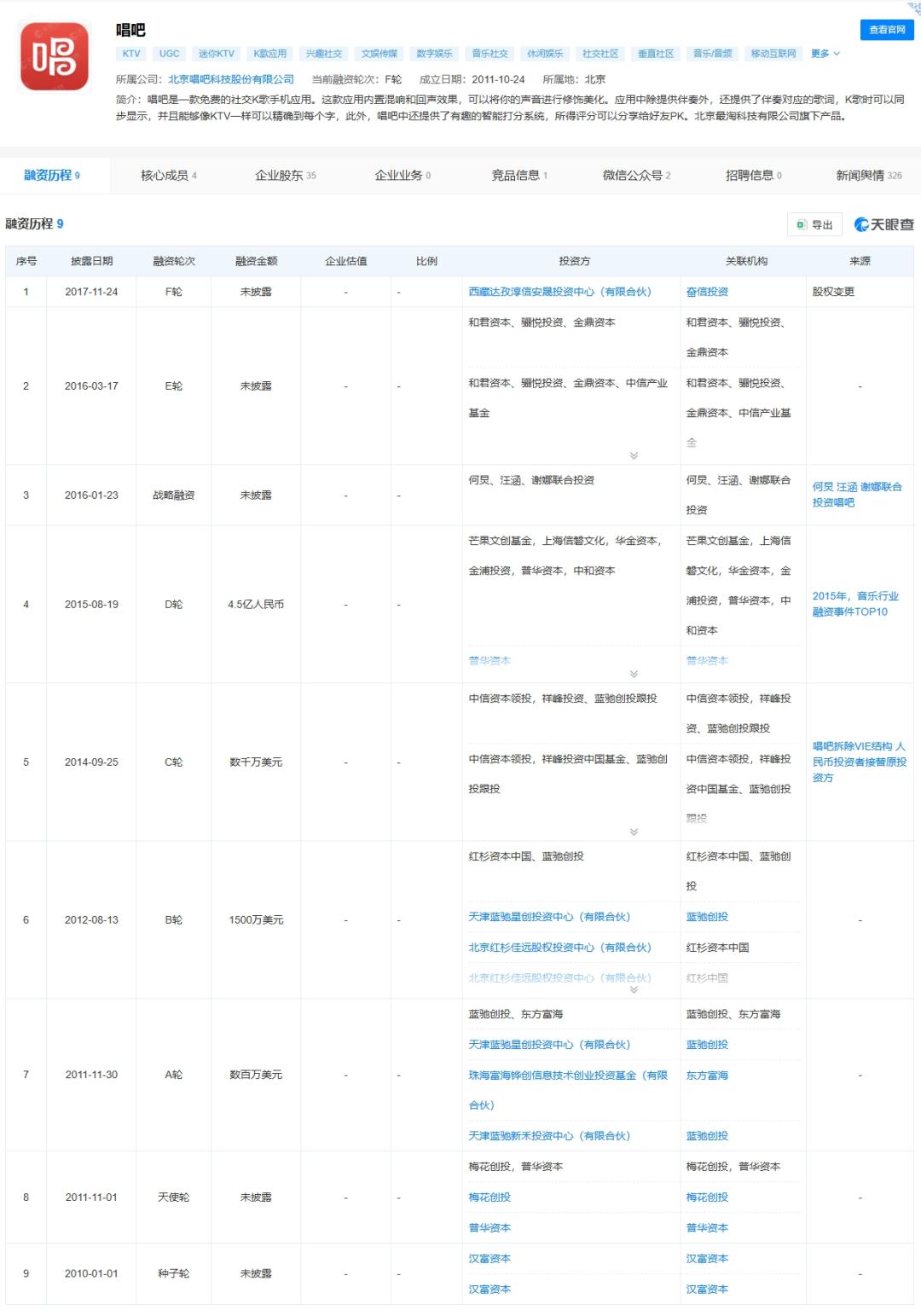 唱吧的融资历程,则清晰地反映出资本市场对其态度的转变。天眼查显示,过去十余年,唱吧先后获得9轮融资,2016年正式接受中金公司上市辅导,估值一度冲上6.73亿美元。