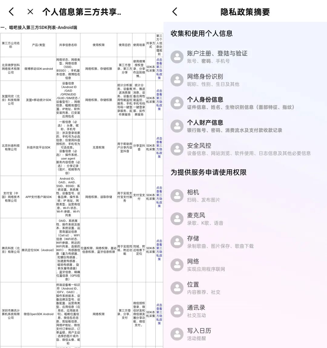 源媒汇查看唱吧《隐私政策》发现,除常规的用户账号信息外,还涵盖了面部特征、指纹以及银行账号、消费流水和支付款记录等个人身份信息和个人财产信息。同时,唱吧还会获取麦克风权限收集语音信息,并“为帮助用户发现更多好友”申请通讯录权限等,还可能会与第三方共享用户个人信息。