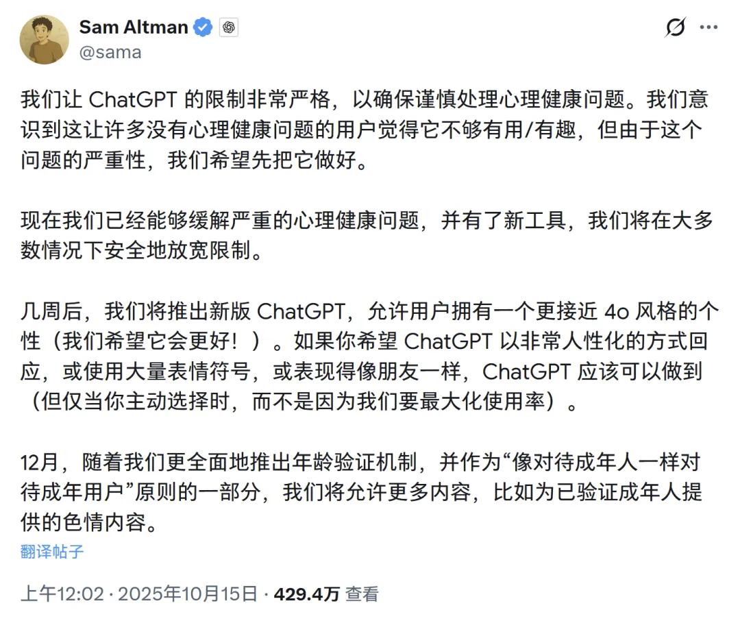 前段时间,OpenAI 的 CEO 山姆·奥特曼宣布,ChatGPT 将在 12 月推出“成人模式”,也就是说允许大家光明正大“搞黄色”了。