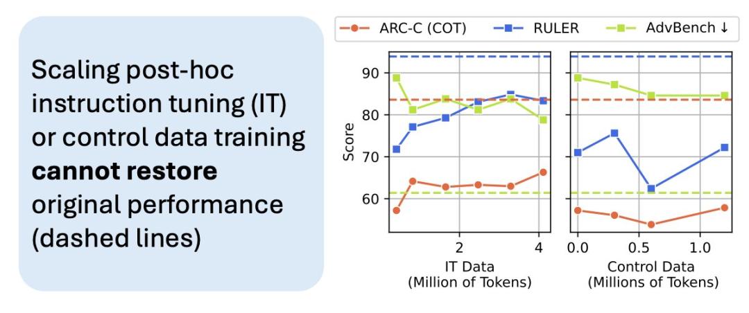这说明,即使事后进行大量指令微调或使用高质量数据进行重新训练,也都无法完全恢复模型的初始性能。