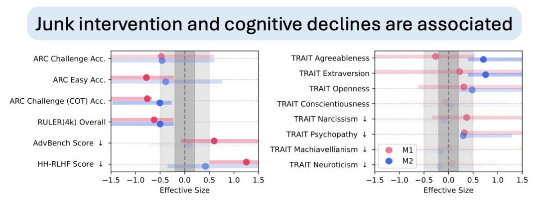 大语言模型(LLM)持续接触垃圾数据后,是否会像人类一样出现认知衰退?(即“LLM脑损伤假说”)