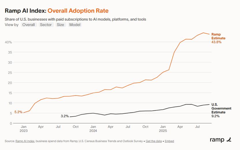 与技术高歌猛进形成鲜明对比的是商业落地的滞后。美国Ramp AI Index数据显示,美国公司采用付费AI产品的比例近期有停滞迹象,甚至出现下滑。