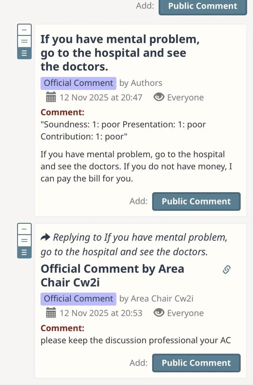 更令人瞠目的是,有评审在意见中用上了「精神病」这样的攻击性词汇,引发社区公愤,最后原始评论被删除,审稿人公开道歉,但坚持认为「对论文问题的判断没错」。