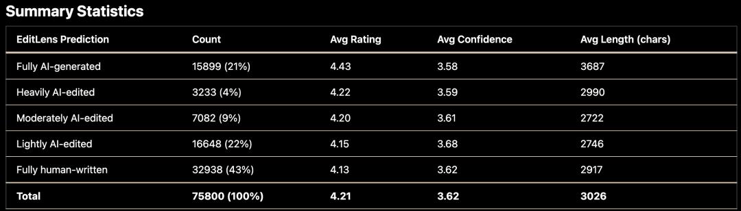 在EditLens的统计里,完全AI生成的评审平均评分4.43分,而完全人写的是4.13分;