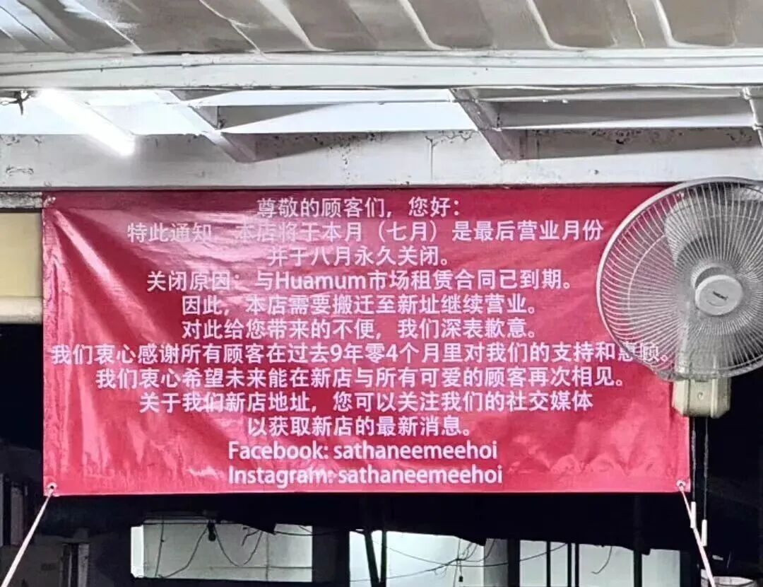 关闭原因是与市场租赁合同到期,店主计划搬迁新址,还将拓展海外市场,首站为马来西亚吉隆坡,泰国境内新店地址暂未确定。