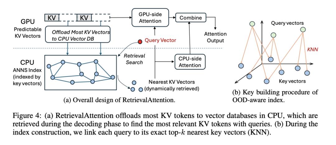 因此,研究团队的核心做法是:把大部分 KV 向量从 GPU 下放到 CPU,每次模型要做推理的时候,就用近似最近邻检索(ANN Search)来找出对当前 Query 最相关的少量 Key,比如只找前 1% 再与 GPU 上少量 “可预测” 的 KV 一起并行计算注意力并合并结果。