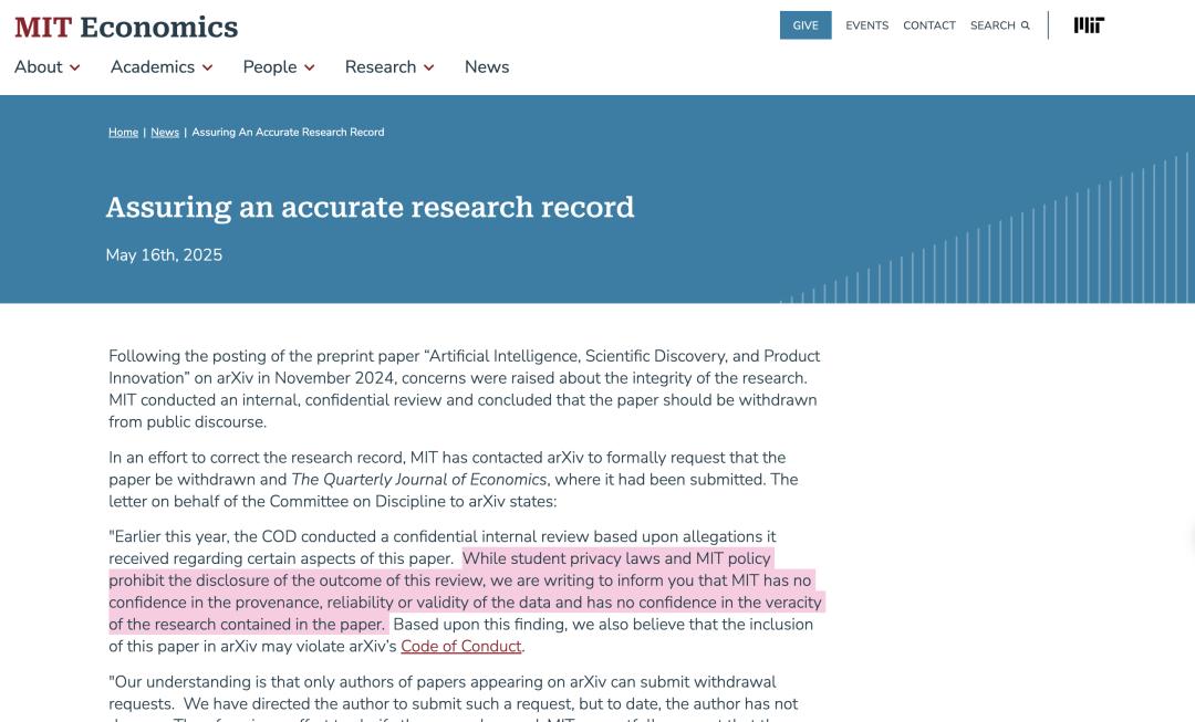 2025 年曝光的 MIT 论文造假事件从侧面反映了这一问题。该论文声称 AI 辅助可使新材料发现量增加 44%、专利申请量提升 39%,一度被奉为 「AI 对科学影响的最佳研究」,甚至被一众科学大佬点赞。但后续调查发现,论文数据存在造假。虽然校方由于隐私未将调查结果披露,但在声明中明确表示「对论文所用数据的来源、可靠性及研究结论的真实性均存疑」。