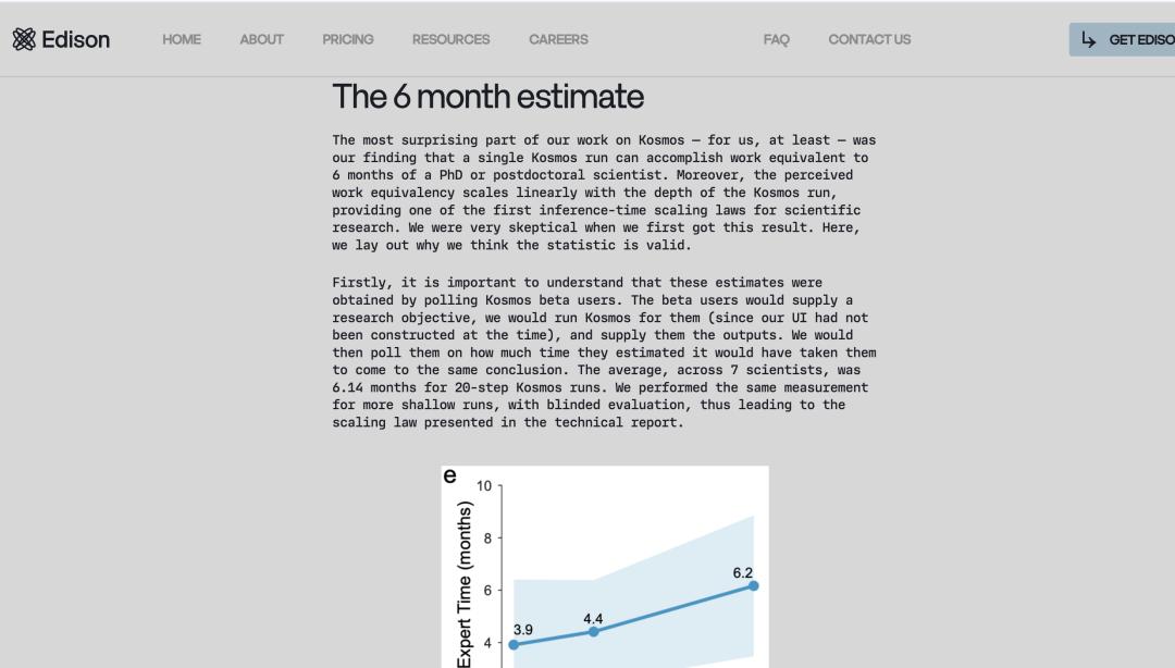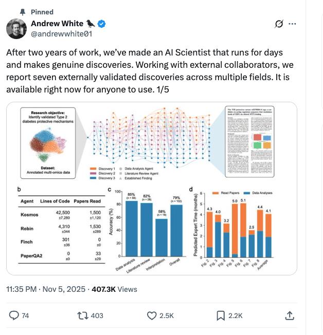 更具代表性的是 AI 科学家 Kosmos 的表现:单次运行可自动阅读 1,500 篇学术论文,执行 4.2 万行代码,代码生成量较同类系统提升 9.8 倍,仅需 1 天时间就能完成相当于人类科学家 6 个月的研究工作量。