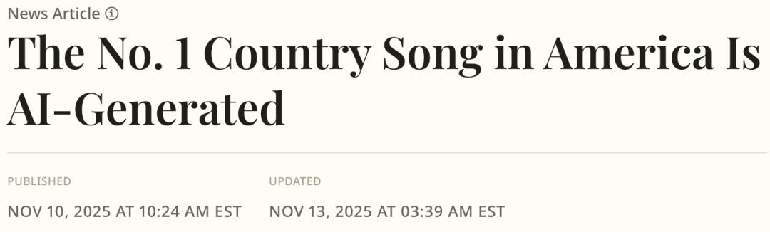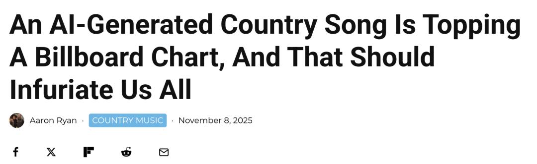 AI乡村音乐登顶冠军的那一刻,不只是乡村音乐歌手的「失败」,更像是一次响彻整个行业的警报:AI正以迅雷不及掩耳之势吞没音乐世界。