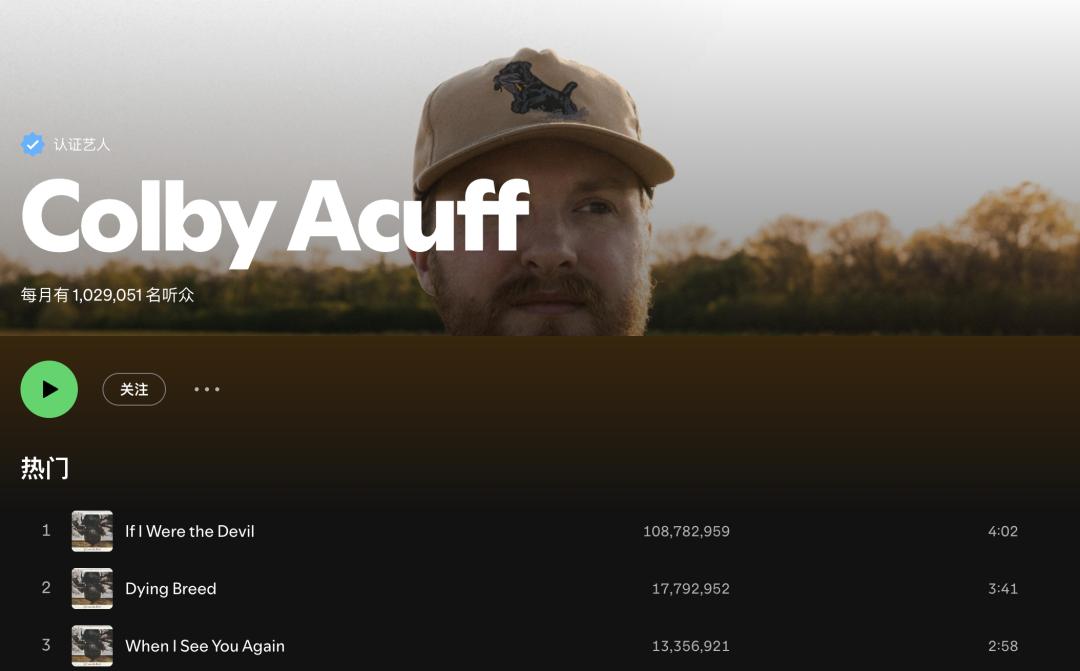 作为对比:真正的艺术家Colby Acuff,倾注全部心血创作音乐、上个月刚发布新专辑,也才刚过一百万月听众。