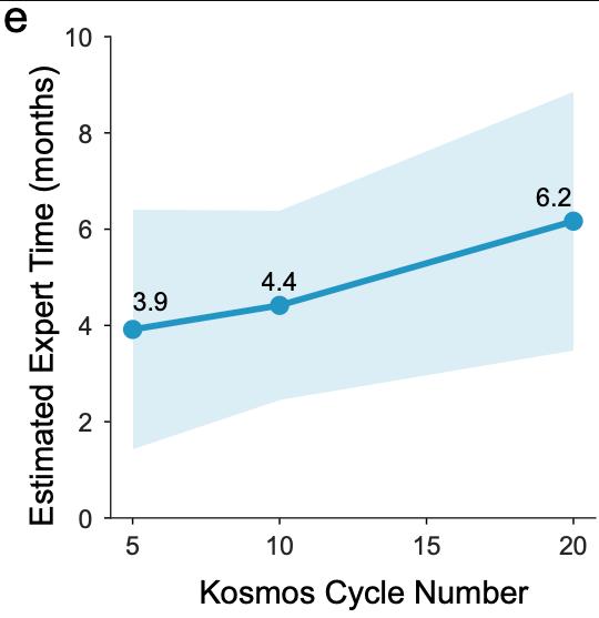 其次,研究人员进行了独立测算:假设阅读一篇论文需15分钟,完成一次分析轨迹需2小时(与METR对软件工程任务的评估一致),那么科斯莫斯单次运行处理的工作量,相当于研究人员4.1个月的全职工作(按每周40小时计算)。