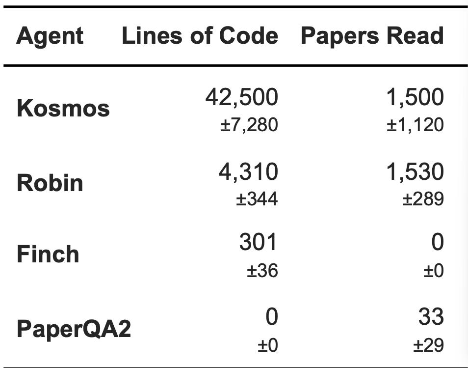 首先,技术报告中三项由科斯莫斯复现的发现,原研究平均耗时约4个月。这些研究在科斯莫斯运行期间要么尚未发表,要么是在模型训练截止日期之后才发表(研究人员已确保科斯莫斯无法获取相关论文)。科斯莫斯在单次运行中就能复现这些核心发现,这为效能评估提供了客观依据。