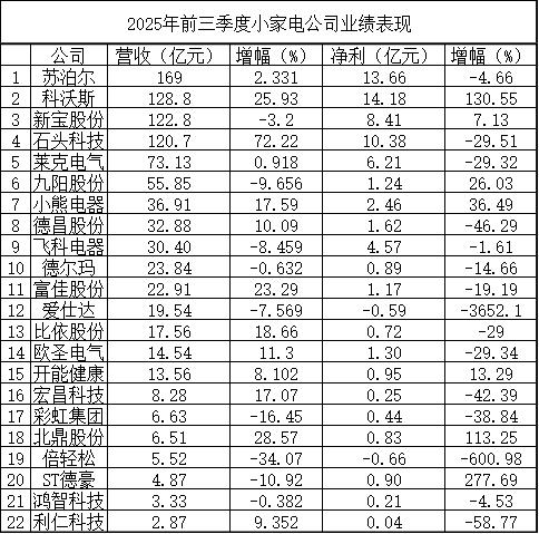 而据A股22家小家电上市公司披露的前三季度业绩:15家公司业绩出现不同程度的下滑,有两家公司盈转亏;另7家公司业绩同比增长,有3家公司净利润翻番。