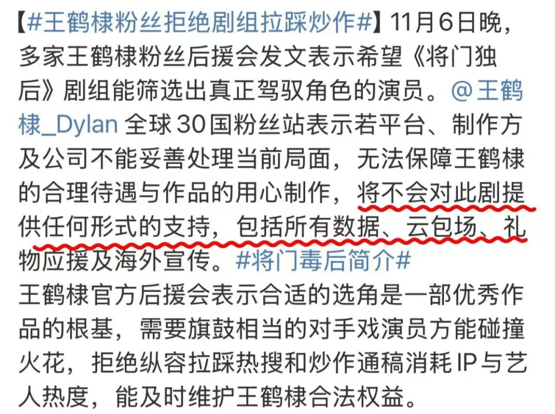 例如,前几天闹得沸沸扬扬的《将门独后》,王鹤棣粉丝直接向腾讯视频放话:“如果女主是孟子义,这部剧的云包场我们一分钱不花。”