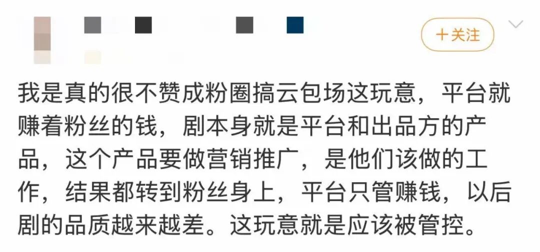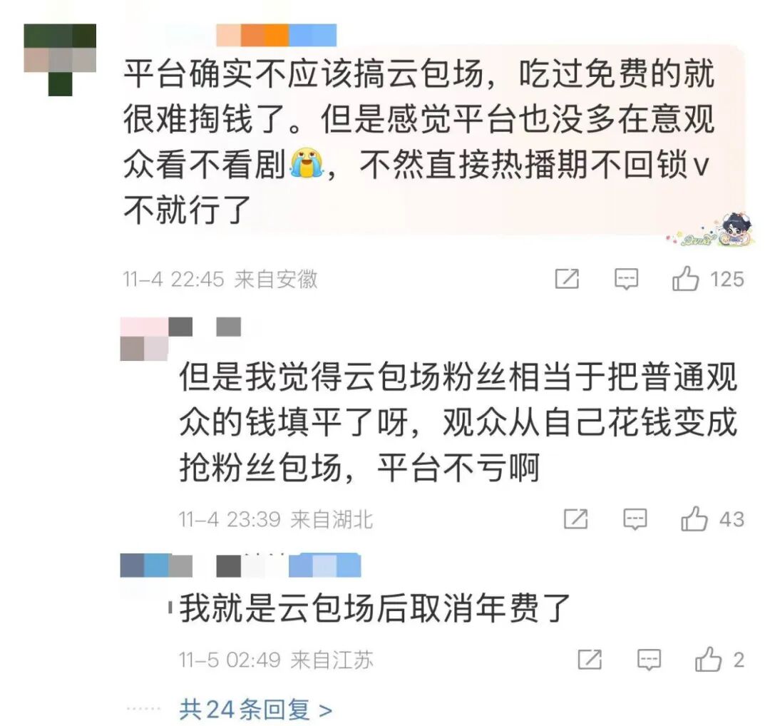 如果说早期的云包场还倾注了粉丝对演员、对剧集的情感表达,那么现在,云包场更像是一场赤裸裸的“权利游戏”。包得多,就能发声更大;包得少,就只能噤若寒蝉。