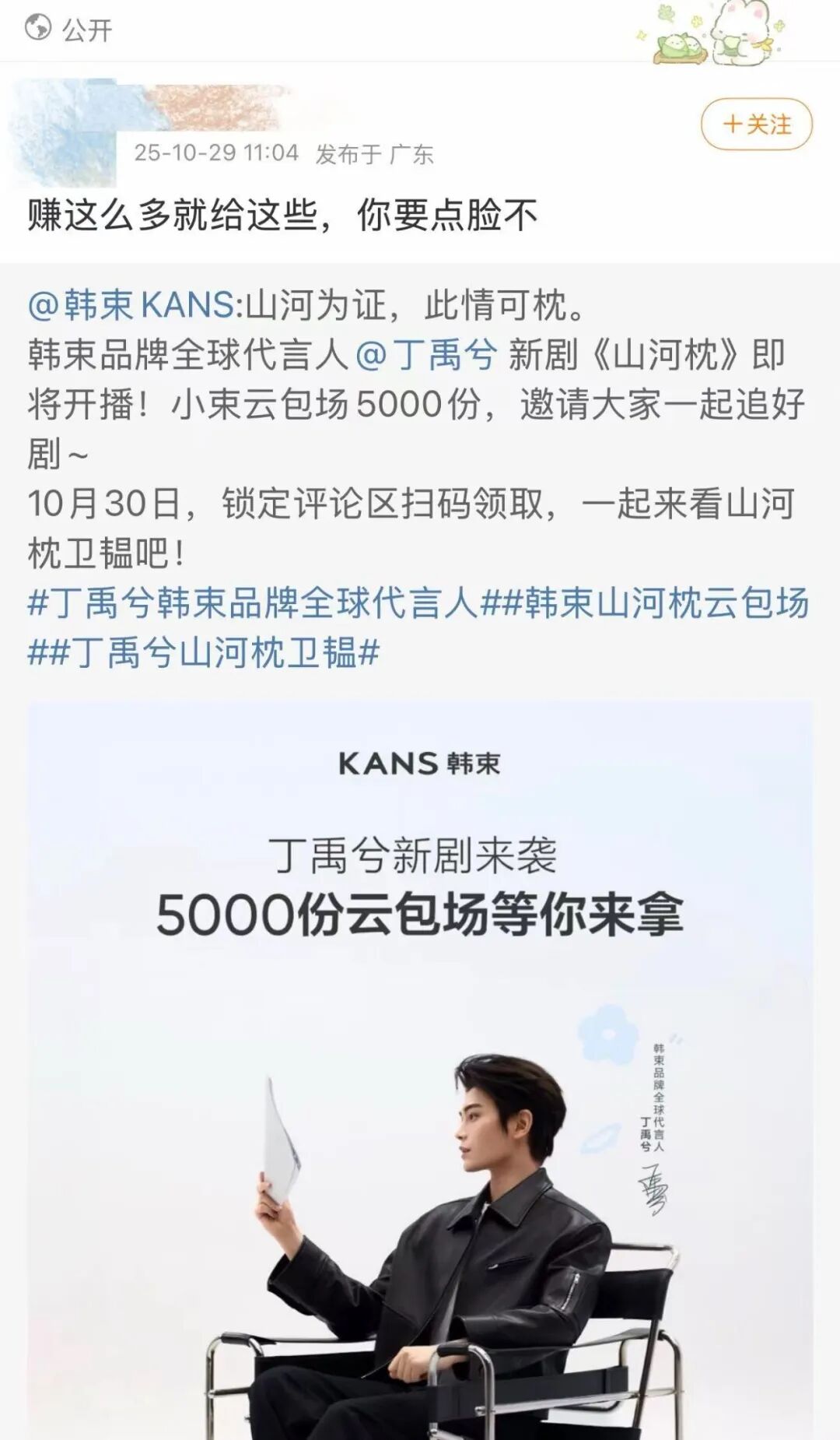 比如,《山河枕》还未开播,主演丁禹兮的粉丝就立刻喊话韩束(丁禹兮代言品牌),让他们也“表示一下”。韩束品牌官微的评论区,一度被丁禹兮粉丝淹没:“连自家代言人都不包场吗?”