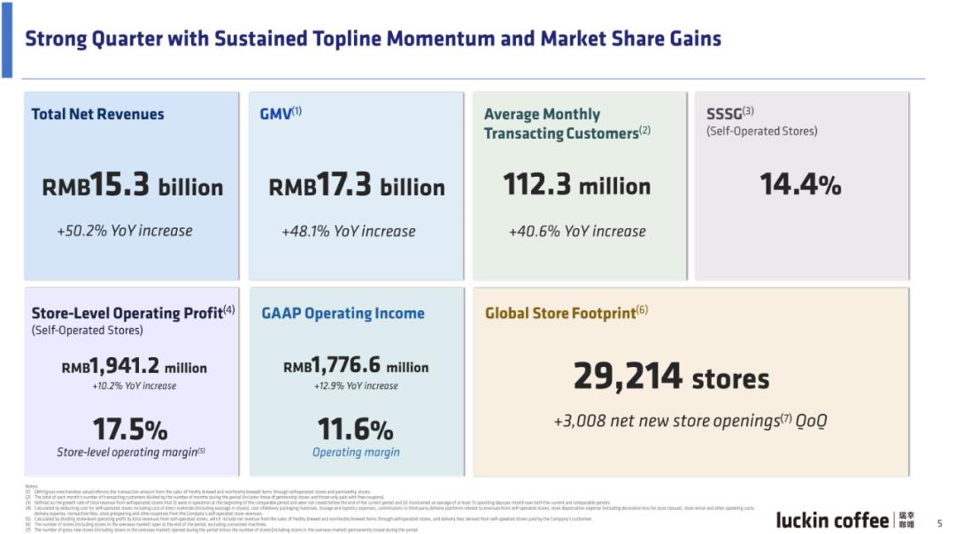 今年第三季度,瑞幸实现总净收入为152.87亿元,同比增长50.2%;GMV约为173.20亿元;自营门店收入为110.80亿元,同比增长47.7%;联营门店收入同比增长62.3%至37.99亿元。