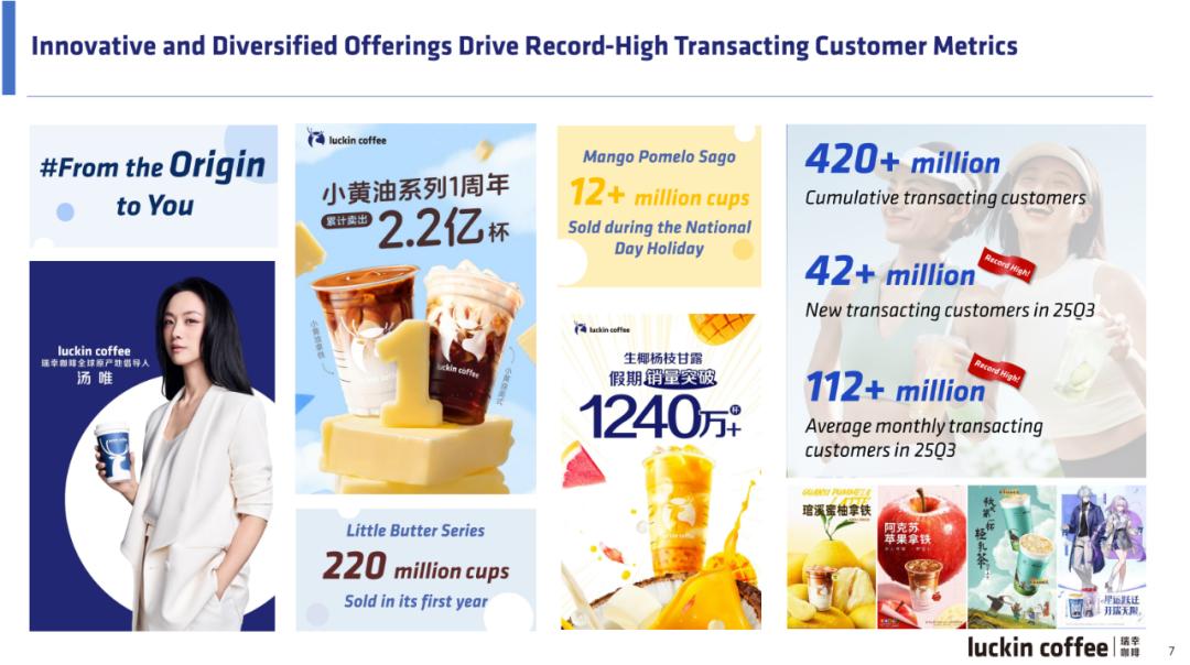 郭谨一表示,“今年第三季度,我们首次达成月均交易客户数破亿的重要里程碑。”财报显示,瑞幸第三季度新增交易客户超4200万,月均交易客户数同比增长40.6%达1.12亿,以上两个指标均创历史新高;截至三季度末,瑞幸累计交易客户数突破4.2亿。