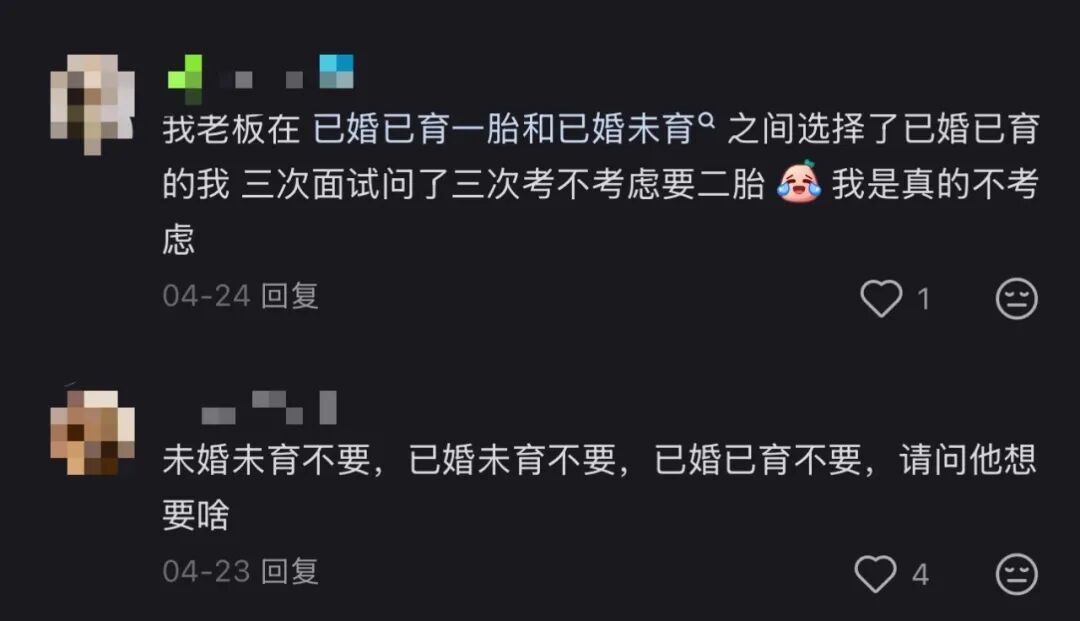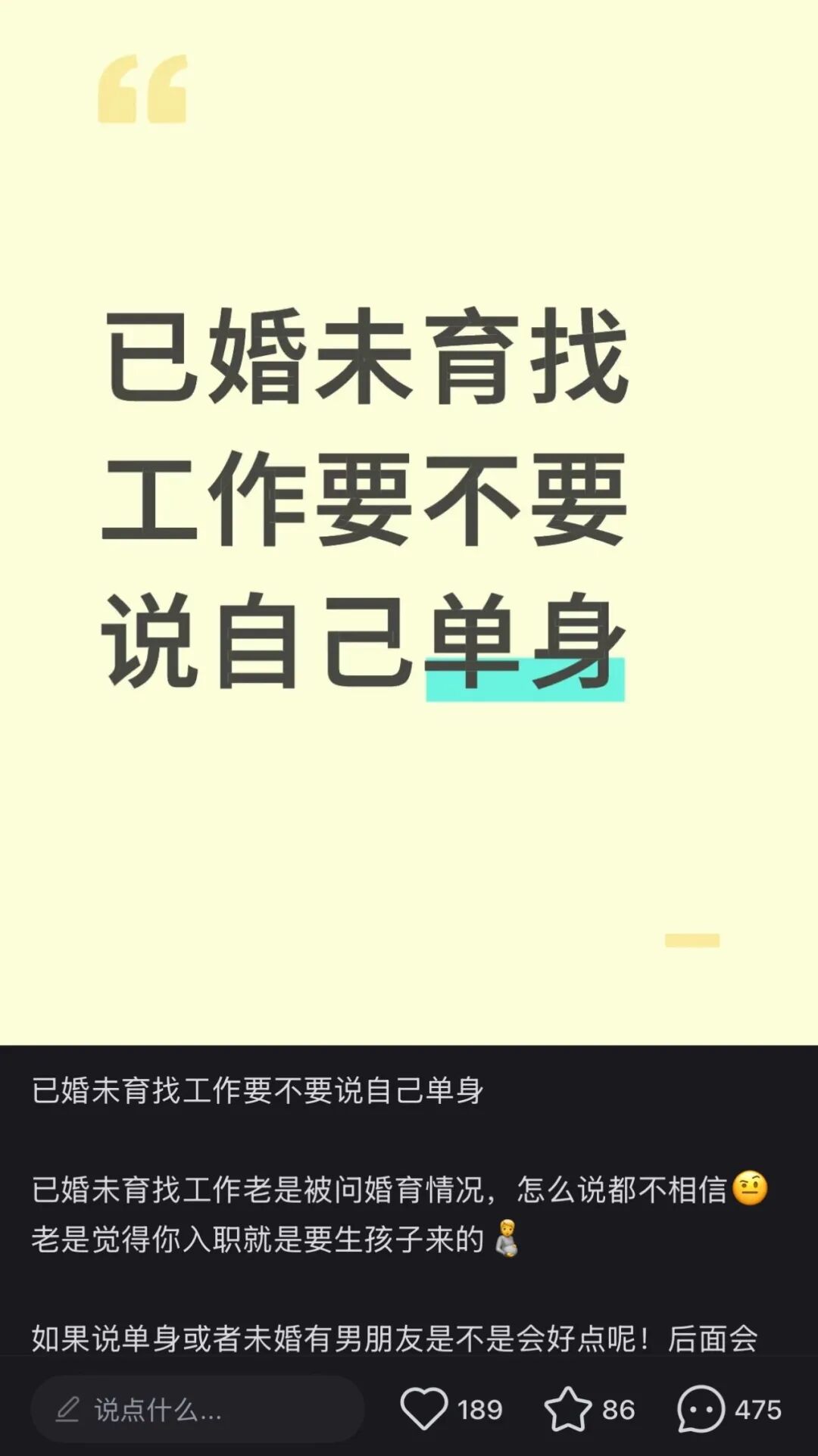 在小红书上,和小艾这样隐瞒婚育状况的女性求职者还有很多。她们大多是30岁以上、未婚育,担心公司觉得自己不稳定。还有很多人谈论起大龄女性求职的鄙视链,“未婚未育还不是最惨的,已婚未孕才是最底端。”