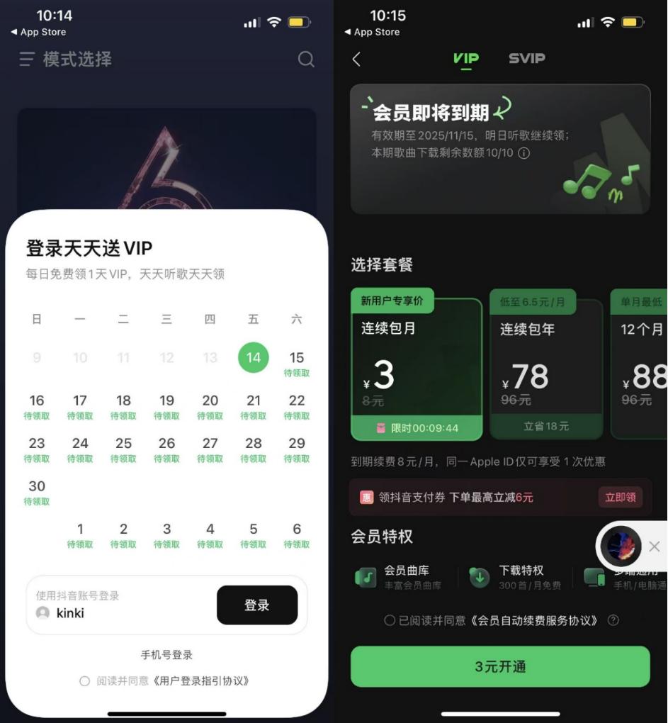 但汽水音乐的打法却与传统平台截然不同,其商业模式更接近“流量入口”而非“内容平台”。汽水音乐采取的是“免费+订阅”双模式,虽然其也布局了付费会员与广告收入两大变现路径,但却通过大量优惠措施,比如登录打卡领会员、周卡低价包等,降低了用户的使用门槛。