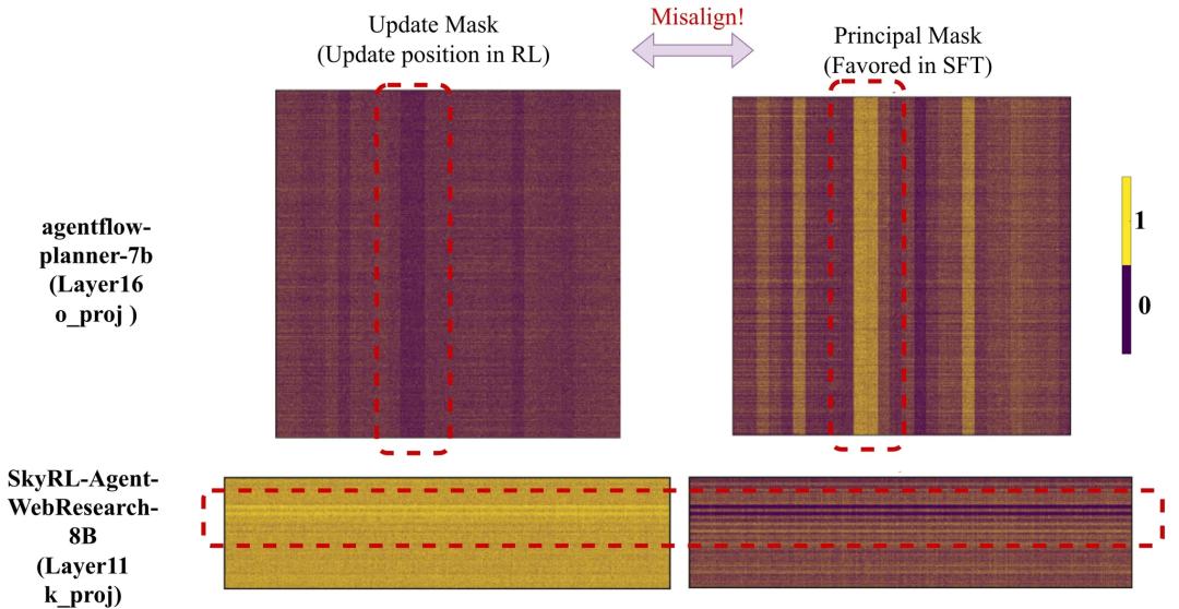 研究人员将RL的更新掩码与主权重掩码M_princ、低幅值掩码M_low,以及二者的组合M_princ ∩ M_low^c进行对比。