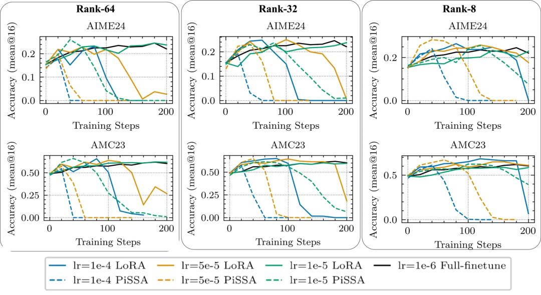 下图中,是LoRA与PiSSA在DS-Qwen-1.5B(DeepMath-103K)上的表现对比。